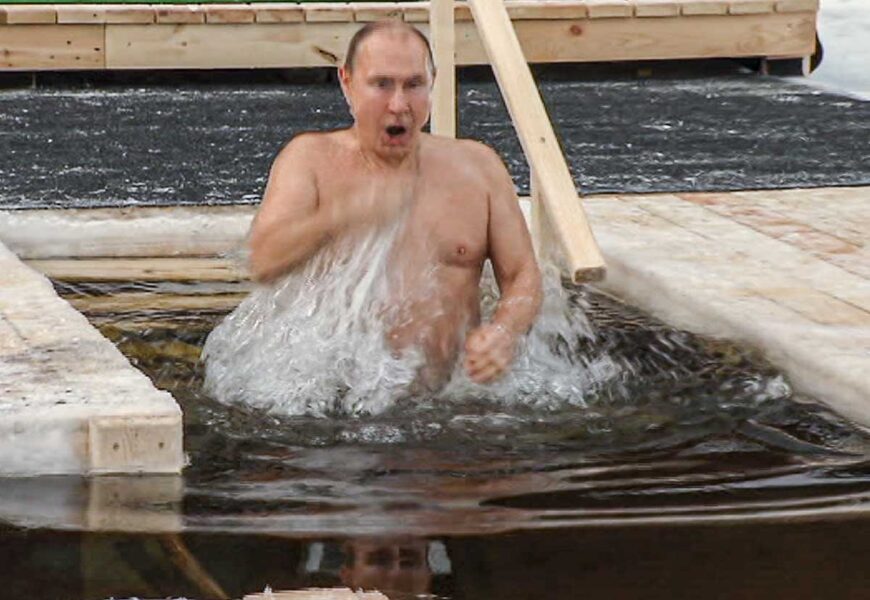 Tras quitarse un grueso abrigo y las botas, el jefe del Kremlin, de 68 años, con un traje de baño azul, entró en una piscina frente a una gran cruz translúcida, aparentemente tallada en el hielo y rodeada de nieve.