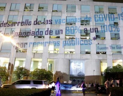 ¡Liberen las patentes!”, fue una de las frases que la organización proyectó con un haz de luz sobre el edificio de la empresa en...